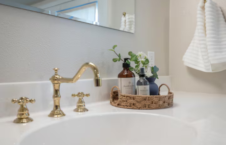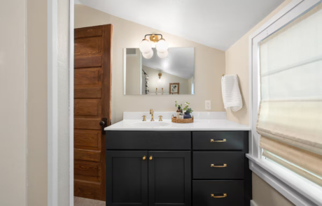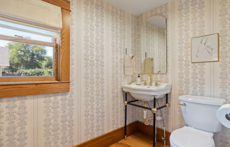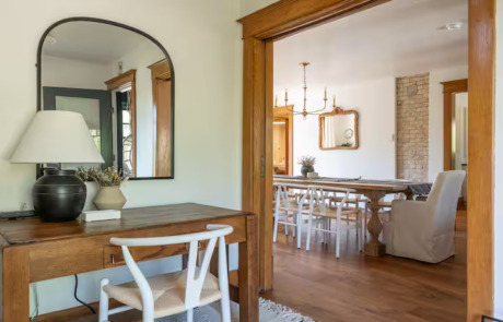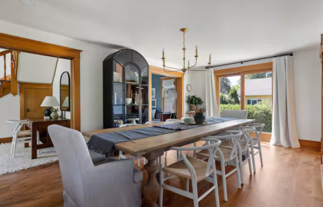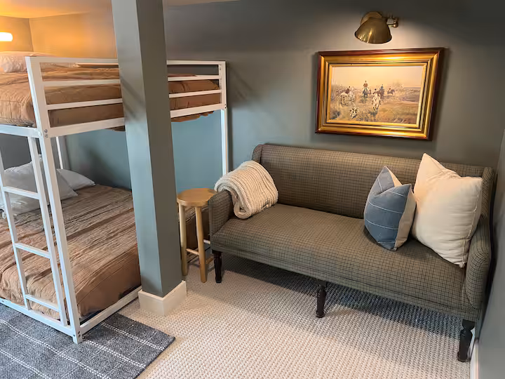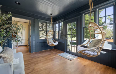 The main level sports a chef’s kitchen, sun room with swing chairs, 10 person dining room, cozy sitting room, desk with chair, and a half bathroom.