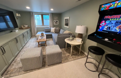 The basement hosts a movie/game room, bedroom, laundry room, and full bathroom. The movie room features a large screen TV, an arcade machine with 4,000 games, an Xbox with 4 controllers, a variety of board/card games, kid toys, and a cozy couch for a fun night in. The garage also has a ping-pong table as another opportunity for family fun.