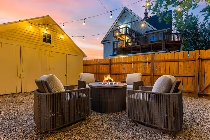 The outdoor area is completely fenced in with a relaxing fire table.