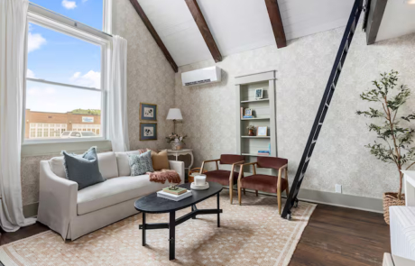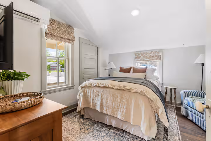 The beautiful living room doubles as a conversation area or cozy movie night setting. The TV uses Roku which allows you to log into your accounts and stream your favorite shows.